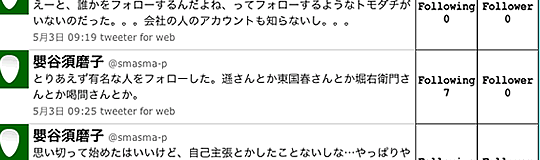 ■つぶやきの右隣に表示されているのは、その時点でのフォロー/フォロワーの数です。そこからも、彼女の置かれた状況を想像してみてください。
