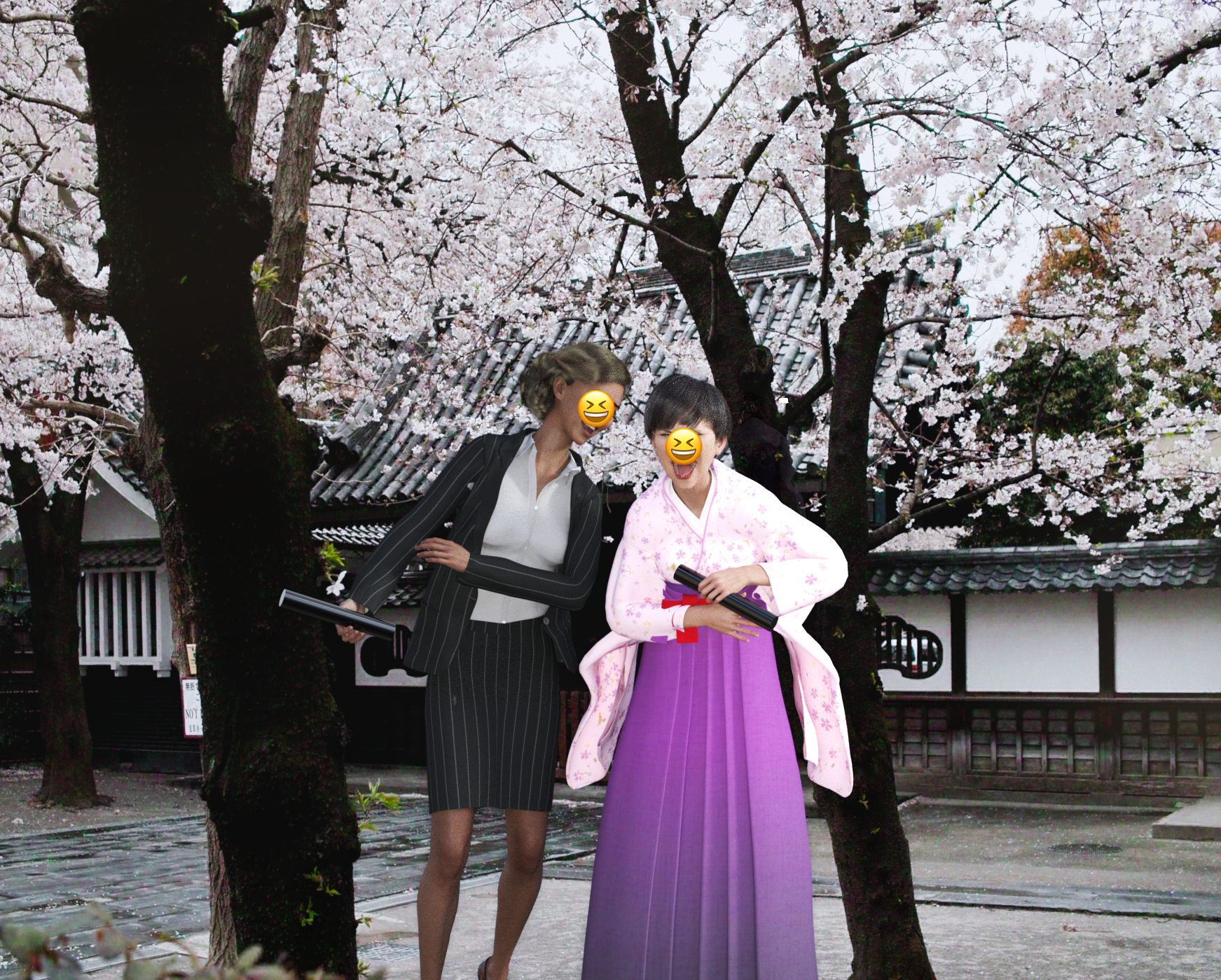 近所のお寺で桜の写真を撮ってたんだけど、どうやら近くの大学で卒業式があったようだね。知らない人だったけど、あんまり楽しそうだったからつい撮っちゃったよ。2人はずーっと爆笑しててすごい仲良しなんだろうな。にしても曇り空の桜は映えないな。