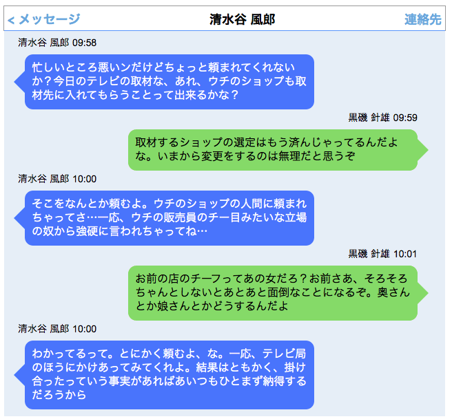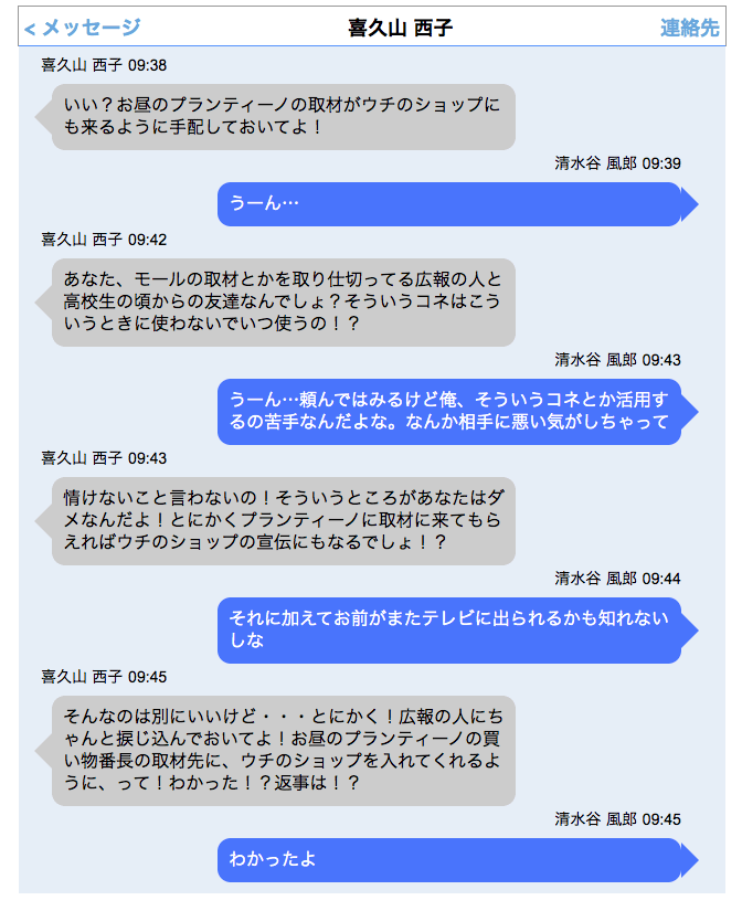 あの人なら知ってる。このモールの広報部の人だ。イベントの企画とかを担当してる、結構えらい人だよね。たしかうちのショップの店長と高校か大学の同級生なんだよなー。